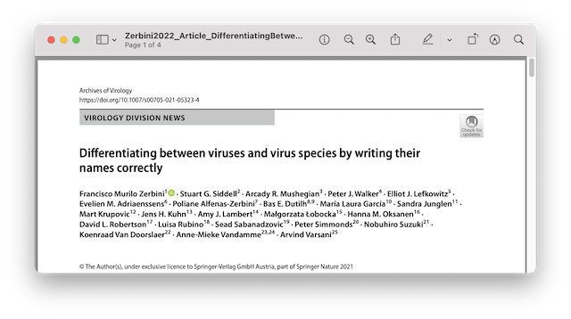 Zerbini FM, Siddell SG, Mushegian AR, Walker PJ, Lefkowitz EJ, Adriaenssens EM, Alfenas-Zerbini P, Dutilh BE, García ML, Junglen S, Krupovic M, Kuhn JH, Lambert AJ, Łobocka M, Oksanen HM, Robertson DL, Rubino L, Sabanadzovic S, Simmonds P, Suzuki N, Van Doorslaer K, Vandamme AM, Varsani A. Differentiating between viruses and virus species by writing their names correctly. Arch Virol. 2022 Jan 19. doi: 10.1007/s00705-021-05323-4. Epub ahead of print. PMID: 35043230.
