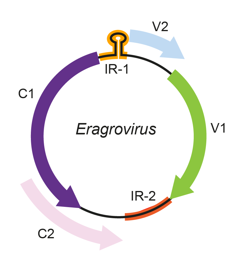 Figure 1. Eragrovirus. Genomic organization of eragroviruses. ORFs are denoted as being encoded on the virion-sense (V) or complementary-sense (C) strand. The positions of the stem-loop motif containing the conserved 5′-TAAGATTCC-3′ sequence in the intergenic region 1 (IR-1) and the location of intergenic region 2 (IR-2) are shown. |