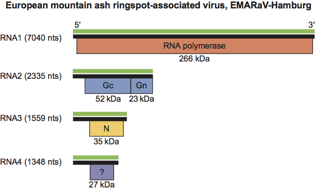 Figure 2 Genome organization of the Hamburg isolate of the species European mountain ash ringspot-associated virus. Green lines represent the virion-sense RNA and black lines the virion-complementary sense RNA, from which the proteins shown are translated. Gn and Gc are the two putative glycoproteins cleaved from the precursor molecule. N is the nucleocapsid protein.