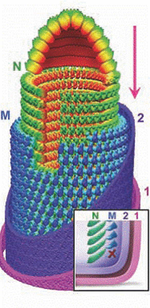 Figure 4 Architecture of the vesicular stomatitis virus virion. Montage model of the tip and cryoEM map of the trunk. N is green, M is blue, and the inner (2) and outer (1) leaflets of the membrane are violet and pink. (Inset) illustration of the base region of the VSV virion. The X marks the absence of a turn of M helix below the lowest turn of the N helix.