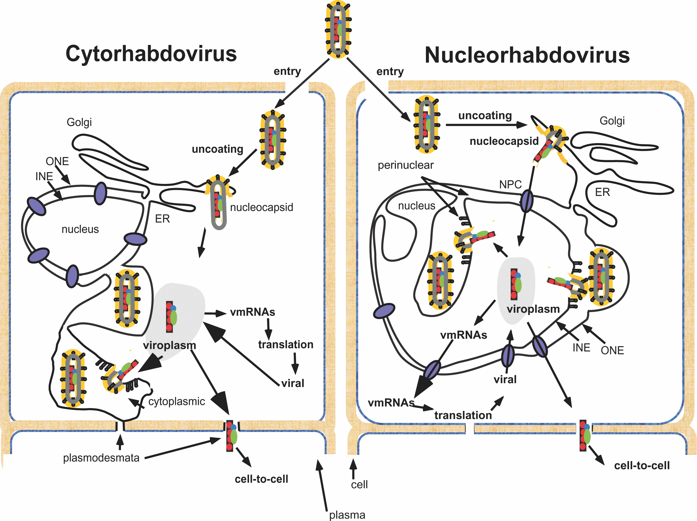Figure 5 Contrasts between the replication cycles of cytorhabdoviruses and nucleorhabdoviruses. Most rhabdoviruses gain entry into host cells during insect vector feeding. Uncoating is believed to take place on ER membranes, followed by release of the nucleocapsid core into the cytoplasm. At this point, the replication cycles of the two genera diverge. In the case of the cytorhabdoviruses, the newly released cores become transcriptionally active and associate with the endoplasmic reticulum to establish viroplasms that function in transcription of viral mRNAs (vmRNAs) and replication of genomic and antigenomic viral RNAs. Following translation of the vmRNAs, viral proteins involved in replication accumulate in the viroplasm. Viral glycoproteins are targeted to cytoplasmic membranes or, possibly, the outer nuclear envelope (ONE). Maturation of cytorhabdoviruses takes place via matrix protein-mediated condensation of cores at sites of G protein accumulation in the endoplasmic reticulum. In the case of the nucleorhabdoviruses, released cores are transported into the nucleus through nuclear pore complexes (NPC). Following transcription and export, vmRNAs are translated and viral proteins are imported into the nucleus, where they participate in replication and formation of large viroplasms. During intermediate stages of infection of plant rhabdoviruses, movement of infectious units from cell to cell occurs. Nucleocapsids most likely are the transported form, and these interact with viral encoded movement proteins that participate in number of activities, including nucleocapsid binding, transport through the NPC to the plasmodesmata, and modifications to the plasmodesmatal size exclusion limits. Morphogenesis occurs near the end of active transcription and replication and involves interactions with the M protein to coil the viral nucleocapsids and form associations with membrane-associated G protein. In the cytorhabdoviruses, electron microscopic observations suggest that budding occurs into proliferated ER associated with the viroplasms. Currently, at least two models can be proposed for morphogenesis of nucleorhabdovirus virions. In recent data outlined in the text, the inner nuclear envelope (INE) proliferates due to redistribution of cytoplasmic membranes and invaginates to form intranuclear spherules, into which viral budding occurs. In the classical model, virus budding occurs through intact INE resulting in an expansion of the outer nuclear envelope. In both models, mature virions accumulate in the perinuclear spaces of infected cells where they may be reacquired during subsequent insect feeding.