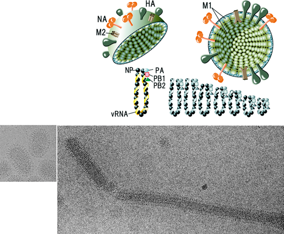 Figure 1 (Top) Diagram of an influenza A virus (FLUA) virion in section. The indicated glycoproteins embedded in the lipid membrane are the trimeric hemagglutinin (HA), which predominates, and the tetrameric neuraminidase (NA). The envelope also contains a small number of M2 ion channel proteins. The internal components are the M1 (matrix) protein and the viral ribonucleoprotein (RNP) consisting of RNA segments, associated nucleocapsid protein (NP), and the PA, PB1 and PB2 polymerase proteins. NS2 (NEP), also a virion protein, is not shown. (Bottom) Frozen-hydrated images of a spherical A/Aichi/2/68 X-31 virion (left) and a filamentous A/Udorn/72 virion (right)
