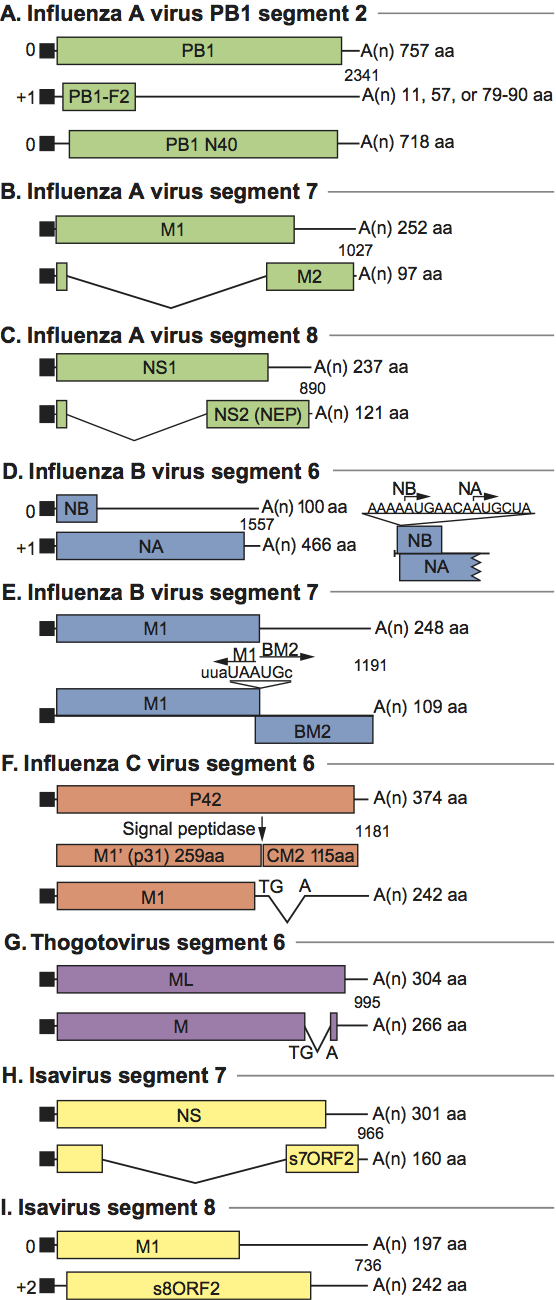 Figure 2 Orthomyxovirus genome organization. The genomic organization and ORFs are shown for genes that encode multiple proteins. Segments encoding the polymerase, hemagglutinin and nucleoprotein genes are not depicted as each encodes a single protein. (A) Influenza A virus PB1 segment ORFs. Initiation of PB1 translation is thought to be relatively inefficient based on Kozaks rule, likely allowing initiation of PB1-F2 translation by ribosomal scanning and results in PB1-F2 proteins of different size. In addition, the use of a second AUG, present in many but not all viruses, in frame in the PB1 ORF as the initiation codon encodes the polypeptide PB1 N40, the C terminal 718 amino acids of PB1. (B) Influenza A virus segment 7 showing M1 and M2 mRNAs and their coding regions. M1 and M2 share 9 amino-terminal residues, including the initiating methionine; however, the ORF of M2 mRNA (nt 7401004) differs from that of M1. (C) Influenza A virus segment 8 showing NS1 and NS2 (NEP) mRNAs and their coding regions. NS1 and NS2 (NEP) share 10 amino-terminal residues, including the initiating methionine. The ORF of NS2 (NEP) mRNA (nt 529-861) differs from that of NS1. (D) ORFs in Influenza B virus RNA segment 6, illustrating the overlapping reading frames of NB and NA. Nucleotide sequence surrounding the 2 AUG initiation codons, in the mRNA sense, is shown. (E) Influenza B virus RNA segment 7 ORFs and the organization of the ORFs used to translate the M1 and BM2 proteins. A stopstart pentanucleotide, thought to couple translation between the two ORFs, is illustrated. (F) Influenza C virus mRNAs derived from RNA segment 6. The unspliced and spliced mRNAs encode P42 and M1, respectively. The cleavage of P42 by a signal peptidase produces M1(p31) and CM2. (G) Thogoto virus segment 6 showing M and ML. M is translated from a spliced mRNA with a stop codon that is generated by the splicing process itself, as in Influenza C virus M1 mRNA. ML is translated from the unspliced transcript and represents an elongated form of M with a C-terminal extension of 38 aa. (H) Isavirus mRNAs derived from segment 7. The unspliced mRNA encodes the NS protein and the spliced mRNA encodes a polypeptide of unknown function. (I) Isavirus mRNAs derived from segment 8. ORF1 starts at nucleotide 22 and encodes the M1 protein, ORF2 starts at nucleotide 36, in the+2 reading frame relative to ORF1 and encodes a polypeptide of unknown function. For all panels, the boxes represent different coding regions. Introns in the mRNAs are shown by the V-shaped lines; filled rectangles at the 5 ends of mRNAs represent heterogeneous nucleotides derived from cellular RNAs that are covalently linked to viral sequences. Lines at the 5 and 3 termini of the mRNAs represent untranslated regions.