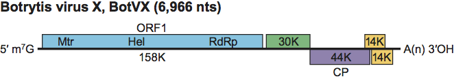 Figure 3 Genome organization of Botrytis virus X showing the relative positions of the ORFs and their expression products. Mtr, methyltransferase; Hel, helicase; RdRp, RNA-dependent RNA polymerase; CP, capsid protein.