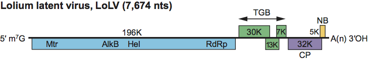 Figure 5 Genome organization of Lolium latent virus showing the relative positions of the ORFs and their expression products. Mtr, methyltransferase; Hel, helicase; RdRp, RNA-dependent RNA polymerase; TGB, triple gene block; CP, capsid protein; NB, putative nucleic acid binding protein.