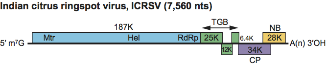 Figure 7 Genome organization of Indian citrus ringspot virus (ICRSV) showing the relative positions of the ORFs and their expression products. Mtr, methyltransferase; Hel, helicase; RdRp, RNA-dependent RNA polymerase; CP, capsid protein; NB, nucleic acid binding protein. The 25K, 12K and 6.4K proteins constitute the triple gene block.