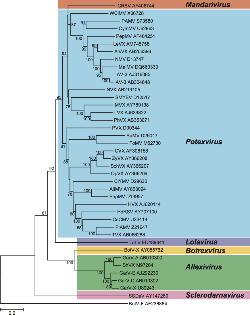 Figure 10 Phylogenetic (distance) tree based on the amino acid sequences of the entire replication protein of members of the family Alphaflexiviridae. A single representative isolate of each sequenced species in the family was included and the tree is rooted with Botrytis virus F (BotV-F; genus Mycoflexivirus, family Gammaflexiviridae). Numbers on branches indicate percentage of bootstrap support out of 1000 bootstrap replications (when >60%). The scale indicates JTT amino acid distances. Tree produced in MEGA4.