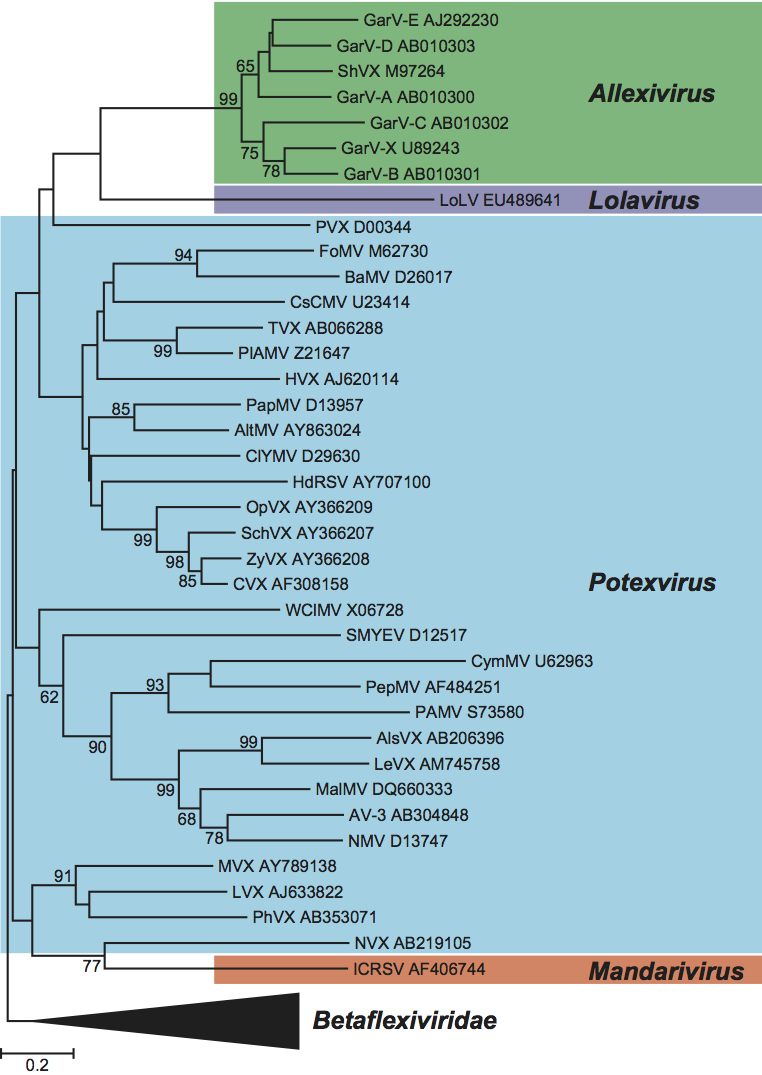 | Allium virus X | [FJ670570 = NC_012211] | (AlVX) |