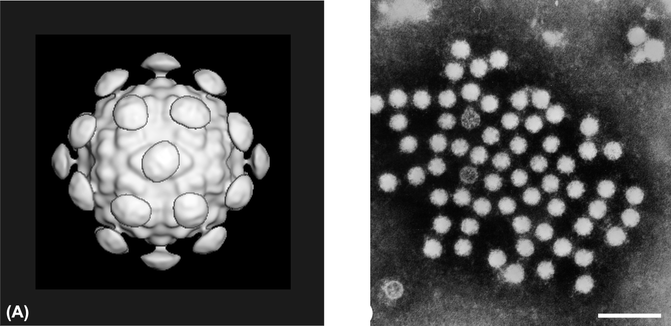 Figure 1 (A) Surface-shaded view of human astrovirus 1 (HAstV-1) reconstructed from 367 images recorded by electron cryo-microscopy and calculated at 30 resolution. The map displays a diameter of 440 and T=3 icosahedral symmetry (courtesy of Dr M. Yeager). (B) Negative contrast electron micrograph of virions of human astrovirus from a stool specimen. The bar represents 100 nm.