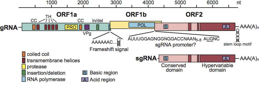 Figure 2 Organization of human astrovirus genomic RNA (gRNA) (HAstV-8). ORF 2 is expressed from a sgRNA detected in the cytoplasm of infected cells.