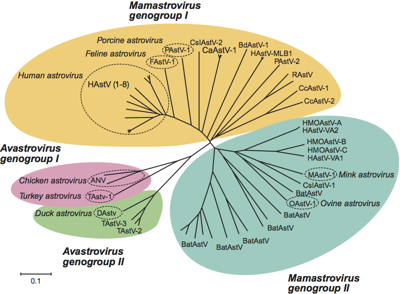 The current avastrovirus species are based on the hosts from which they were isolated. As such, the species do not correspond to genetic phylogenies. The classification of avastrovirus species is currently being redefined. Based on genetic analysis of the complete capsid region at the amino acid level, avian astroviruses will be divided into two main genogroups: genogroup I and genogroup II. Each genogroup includes astroviruses infecting different host species, and can be further subdivided into genotype species based on both genetic and host species criteria. Mean amino acid genetic distances (p-dist) between the two genogroups is 0.704±0.013. Within each genogroup, amino acid genetic distances between genotypes range between 0.576 and 0.741.