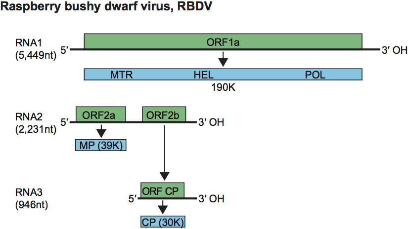 Ziegler, A., Natsuaki, T., Mayo, M.A., Jolly, C.A. and Murant, A.F. (1992). Nucleotide sequence of raspberry bushy dwarf virus RNA-1. J. Gen. Virol., 73, 3213-3218.