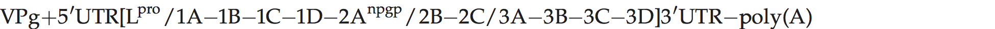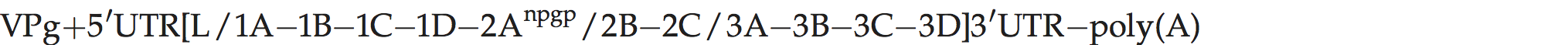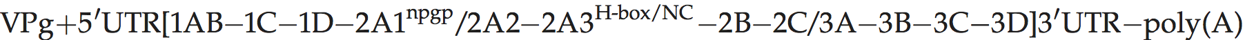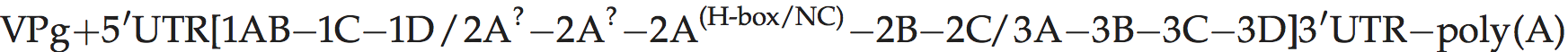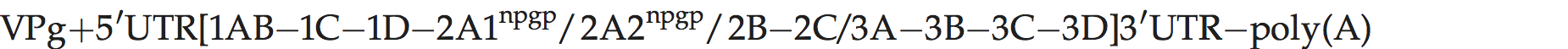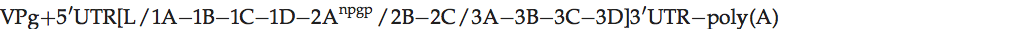 Where “[” and “]” define the extent of the polyprotein-coding region, “/” represents primary cleavages and “−” represents the final cleavages. Where a particular polypeptide is present only in some members of the genus it can be shown between parentheses. This schema can also be used to indicate some protein functions or amino acid motifs where they differ between viruses (e.g. 2Apro or 2Anpgp or 2AH-box/NC). There may be multiple copies of a particular genomic regions in the picornavirus genome, including repeated copies of one particular region (e.g. three 3Bs in the FMDV genome) or different types of a particular region (e.g. two different 2A motifs in Ljungan virus of the genus Parechovirus and three different 2A motifs in the duck hepatitis A virus genome of the genus Avihepatovirus).