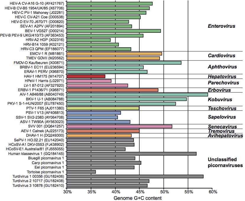 Figure 2 Percentage G+C content of picornavirus genomes.