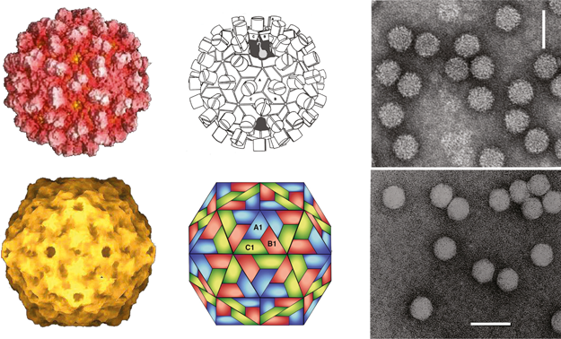 Figure 1 (Top row, left) Computer reconstruction of a tomato bushy stunt virus (TBSV) particle based on X-ray crystallography at 2.9 resolution (J.Y. Sgro, University of Wisconsin-Madison) (Olson et al. (1983). J. Mol. Biol., 171, 61-93). (Top row center) Diagrammatic representation of a T=3 TBSV particle. A, B and C correspond to the three conformational states of the CP. (Top row, right) Negative contrast electron micrograph of TBSV particles. (Bottom row, left) Computer reconstruction of a tobacco necrosis virus A (TNV-A) particle, based on X-ray crystallography at 2.25 resolution (Oda et al. (2000). J. Mol. Biol., 300, 153-169). (Bottom row center) Schematic representation of the T=3 structure of TNV-A particles. A, B, C correspond to the three conformational states of the CP. (Bottom row, right) Negative contrast electron micrograph of particles of TNV (species unidentified). The bars represent 50 nm.