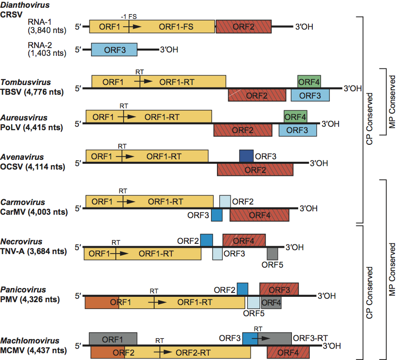 Figure 2 Genome organization of the type species for each genus in the family Tombusviridae. Boxes represent known and predicted ORFs. Similarly shaded boxes represent proteins with sequence conservation with the exception of the gray boxes which represent proteins unique to the indicated virus. The yellow boxes represent ORFs encoding the phylogenetically conserved polymerase. Red-hatched boxes represent CP encoding ORFs. Right-hatched boxes identify CPs lacking a protruding domain that are related to those of the genus Sobemovirus while those which are left-hatched represent tombusvirus-like CPs that contain protruding domains. Blue boxes represent viral MPs. In carmoviruses, necroviruses and panicoviruses the light-blue-shaded box corresponds to a second movement protein conserved among these viruses. In avenaviruses the dark-blue-shaded box corresponds to a potential movement protein that does not show sequence similarity to any of the other movement proteins encoded by the Tombusviridae. In tombusviruses and aureusviruses the green-shaded boxes correspond to the silencing suppressor protein. The orange-shaded region in PMV and MCMV are similar to each other but do not have sequence similarity with other members of the Tombusviridae. RT: translational readthrough of termination codon. 1FS: 1 ribosomal frameshifting event. CP: capsid protein.