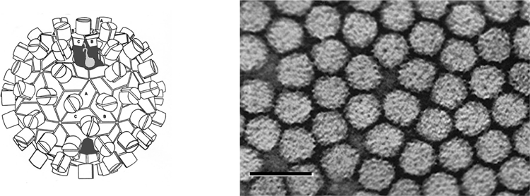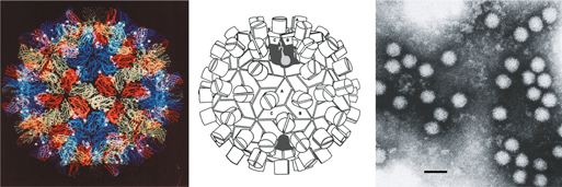 Figure 10 (Left) Computer reconstruction of a carnation mottle virus (CarMV) particle based on X-ray crystallography at 3.2 resolution (from Morgunova et al. (1994). FEBS Letters, 338, 267-271; with permission). (Center) Diagrammatic representation of a carmovirus particle. (Right) Negative contrast electron micrograph of CarMV particles. The bar represents 50 nm.