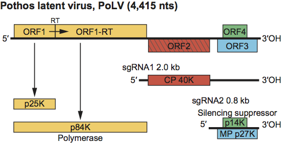 Figure 8 Genome organization and replication strategy of PoLV. Boxes represent known and predicted ORFs with the sizes of the respective proteins (or readthrough products) indicated in the bars below. Yellow ORFs indicate polymerase proteins that have a high degree of sequence conservation within the family Tombusviridae. Left-hatched box identifies the CP that is highly conserved among other genera within the family Tombusviridae that share a protruding domain. The blue box corresponds to the MP which shows sequence similarity to the MP of tombusviruses (see Figure S1). The green box identifies the silencing suppressor that shares sequence similarity with that of tombusviruses (see Figure S1). Lines underneath depict the two sgRNAs that are synthesized in infected cells and which allow for expression of the CP, p14K and the MP. RT=termination codon that is read through.