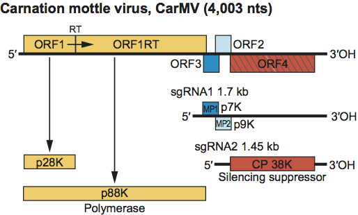 Figure 11 Genome organization and replication strategy of the carmovirus CarMV. Boxes represent known and predicted ORFs with the sizes of the respective proteins (or readthrough products) indicated within the horizontal bars below. Yellow ORFs indicate polymerase proteins that have a high degree of sequence conservation within the family Tombusviridae. Left-hatched box identifies the CP that is conserved among other genera in the family Tombusviridae that have a protruding domain. The dark blue box identifies one (MP1) of the two proteins involved in cell-to-cell movement that exhibits carboxyl-terminal sequence conservation with similar proteins in the machlomoviruses, necroviruses and panicoviruses (see Figure S2). The light-blue box identifies an ORF for a second movement protein (MP2), that shares sequence similarity with the small proteins encoded by viruses in the genera Necrovirus and Panicovirus (see Figure S3). Lines underneath the gene map depict the two sgRNAs that are synthesized in infected cells that encode MP1, MP2 and CP. RT=amber termination codon that is read through. The CP of CarMV is indicated as a suppressor of silencing by analogy to the suppressor activity of other carmovirus CPs (see text).