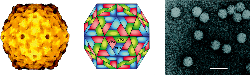 Figure 12 (Left) Computer reconstruction of a tobacco necrosis virus A (TNV-A) particle based on X-ray crystallography at 2.25 resolution (Oda et al. (2000). J. Mol. Biol., 300, 153-169). (Center) Diagrammatic representation of a necrovirus particle. VP1, VP2 and VP3 correspond to the three conformational states of the CP subunit. (Right) Negative contrast electron micrograph of TNV-A virions. The bar represents 50 nm.