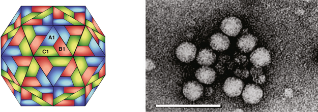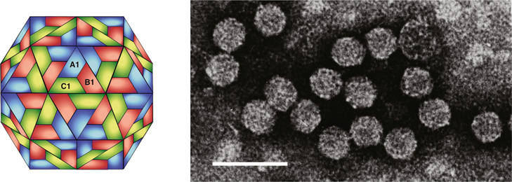 Figure 7 (Left) Diagrammatic representation of a T=3 particle with A, B, C corresponding to the three conformational states of the CP subunit. (Right) Negative contrast electron micrograph of pothos latent virus particles. The bar represents 50 nm.