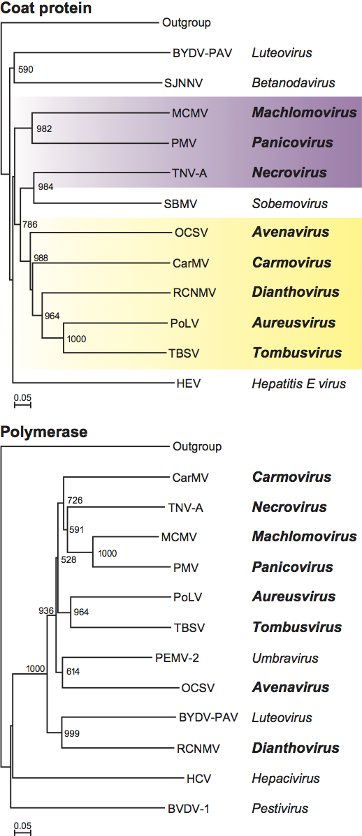 Figure 18 Phylogenetic analysis of CP and polymerase proteins of genera of the family Tombusviridae and relationships to other taxa. The coloured boxes encompass viruses with the two different morphological types of virions, smooth (purple) versus those with a protruding domain (yellow). Protein sequences were aligned and dendograms were constructed using ClustalX2. Genera of the family Tombusviridae are in bold whereas non-members are in regular type. The CP of plum pox virus (family Potiviridae) was used as an outgroup. Barley yellow dwarf virus-PAV is a luteovirus (family Luteoviridae) and southern bean mosaic virus (SBMV) is a sobemovirus. Striped jack nervous necrosis virus (SJNNV) is the type member of the genus Betanodavirus in the family Nodaviridae. A more extensive dendogram that includes the CPs of all members of the Tombusviridae is shown in Figure S5. Polymerase dendogram. Hepatitis virus C-1 (HCV-1) and bovine viral diarrhea virus (BVDV-1) are members of the genera Hepacivirus and Pestivirus, respectively in the family Flaviviridae. Pea enation mosaic virus-2 (PEMV-2) is an umbravirus in the family Luteoviridae and Hepatitis E virus is a hepevirus in the family Hepeviridae. The polymerase of tobacco mosaic virus (family Virgaviridae) was used as an outgroup for generation of the polymerase dendogram. A dendogram depicting relationships of the polymerases among all members of the Tombusviridae is shown in Figure S6.
