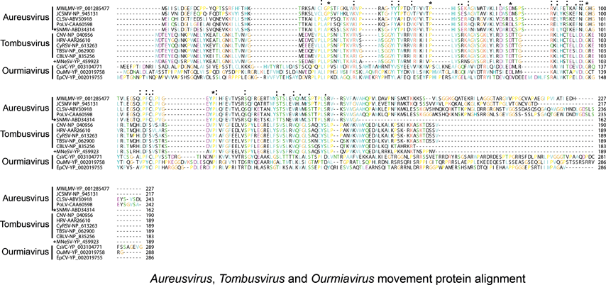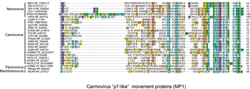 Non-structural proteins include the phylogenetically conserved pre-readthrough proteins of 23–48 kDa and its 82–112 kDa readthrough products. Tombusviruses and aureusviruses encode a conserved 14–19 kDa protein (see Figure S2) which is associated with the suppression of silencing. Viruses in the family utilize at least four phylogenetically distinct MPs. Genomes of tombusviruses and aureusviruses encode a conserved 22–27 kDa MP (see Figure S1) and the dianthovirus genome encodes a second type of MP of about 34 kDa. The carmoviruses, machlomoviruses, necroviruses and panicoviruses encode a 7–8 kDa MP (MP1) which contains a conserved carboxyl-terminus (see Figure S3). The carmoviruses, necroviruses and panicoviruses encode an additional conserved small 6–9 kDa polypeptide (MP2) (see Figure S4). Panicoviruses and machlomoviruses have additional accessory ORFs whose functions have not been determined.