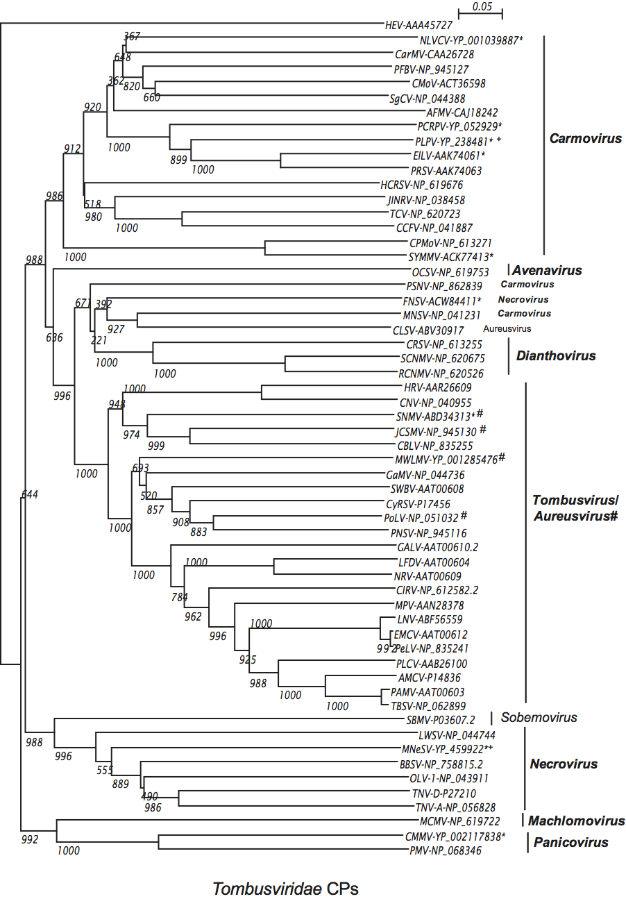 The CPs are conserved among all genera and overall the CP is a reliable indicator of taxonomic identity (see Figure S5). However, exceptions exist. The CPs of tombusviruses and aureusviruses do not separate into distinct groupings. Also, sometimes the CP of a virus does not group with other members of its genus. Examples include the CPs of the carmoviruses melon necrotic spot virus (MNSV) and pea stem necrosis virus (PSNV) that are present in a distinct lineage. This is also the case for the aureusvirus CLSV which does not group with the tombusvirus/aureusvirus lineage. On a structural level, the CPs fall into two main classes: those with a protruding domain (dianthoviruses, tombusviruses, aureusviruses, avenaviruses and carmoviruses) and those without a protruding domain (necroviruses, machlomoviruses and panicoviruses).