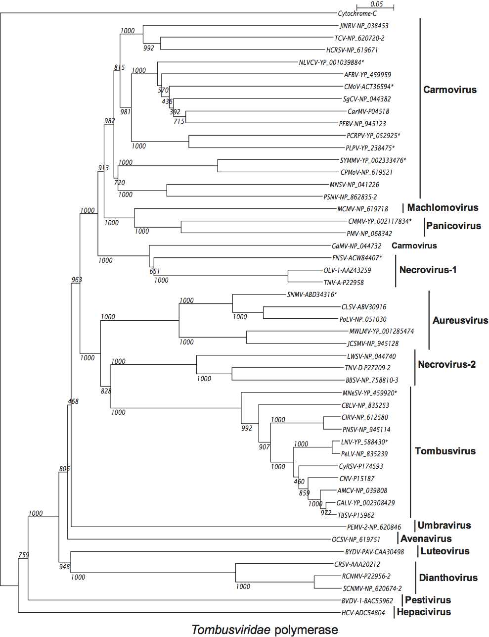 The polymerase is highly conserved among members of the family Tombusviridae with the readthrough (or frameshift) portion showing the greatest level of conservation, i.e. 27–60% identity among type members compared to 2–20% identity in the pre-readthrough (pre-frameshift) region. Phylogenetic analyses (see Figure S6) show that overall the polymerases of members of a genus are more closely related to each other than they are to members of other genera consistent with the notion that such trees are a useful criterion for defining genera. An exception to this is the polymerase of the carmovirus galingsoga mosaic virus which appears to be more closely related to necroviruses. Also, necroviruses are divided into two major groupings: one that is associated with the tombusvirus/aureusvirus lineage and the other with the carmovirus/machlomovirus/panicovirus lineage.