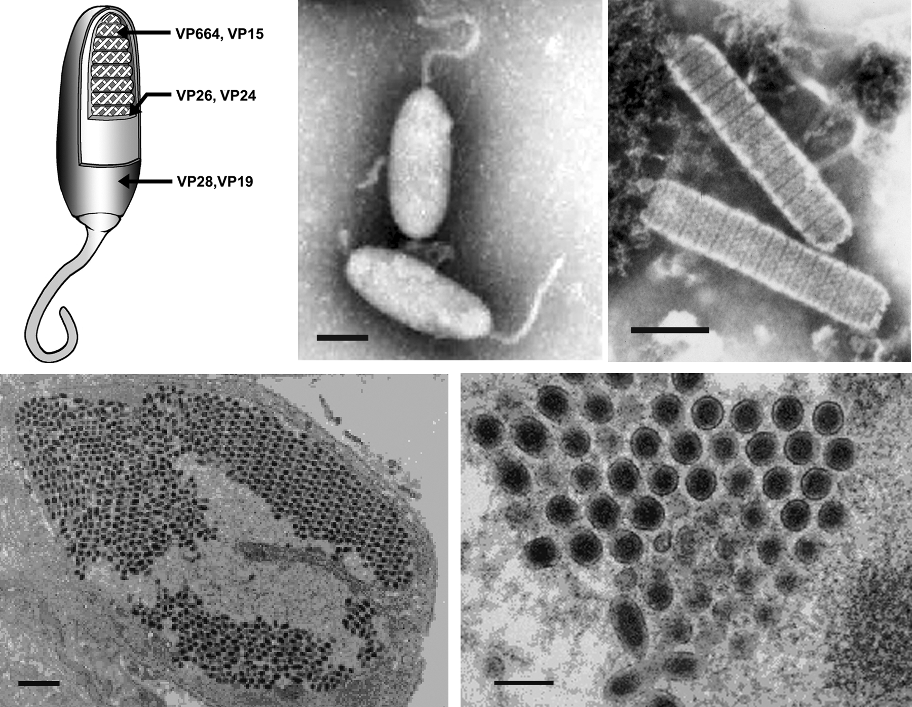 Figure 1 (Top) Morphology of virions of white spot syndrome virus (WSSV). (Left) Schematic illustration of the structure of a typical whispovirus virion. (Top center and right) Negative contrast electron micrographs of WSSV virions (center, courtesy of Marielle van Hulten) and nucleocapsids (right, courtesy of Don Lighter) from hemolymph of infected Penaeus monodon. The bars represent 100 nm. (Bottom left) Thin section of WSSV-infected stomach epithelium showing the parallel arrangement of virions in the nucleoplasm (the bar represents 1 m) and (bottom right) a cross-section of virions (the bar represents 1 m)