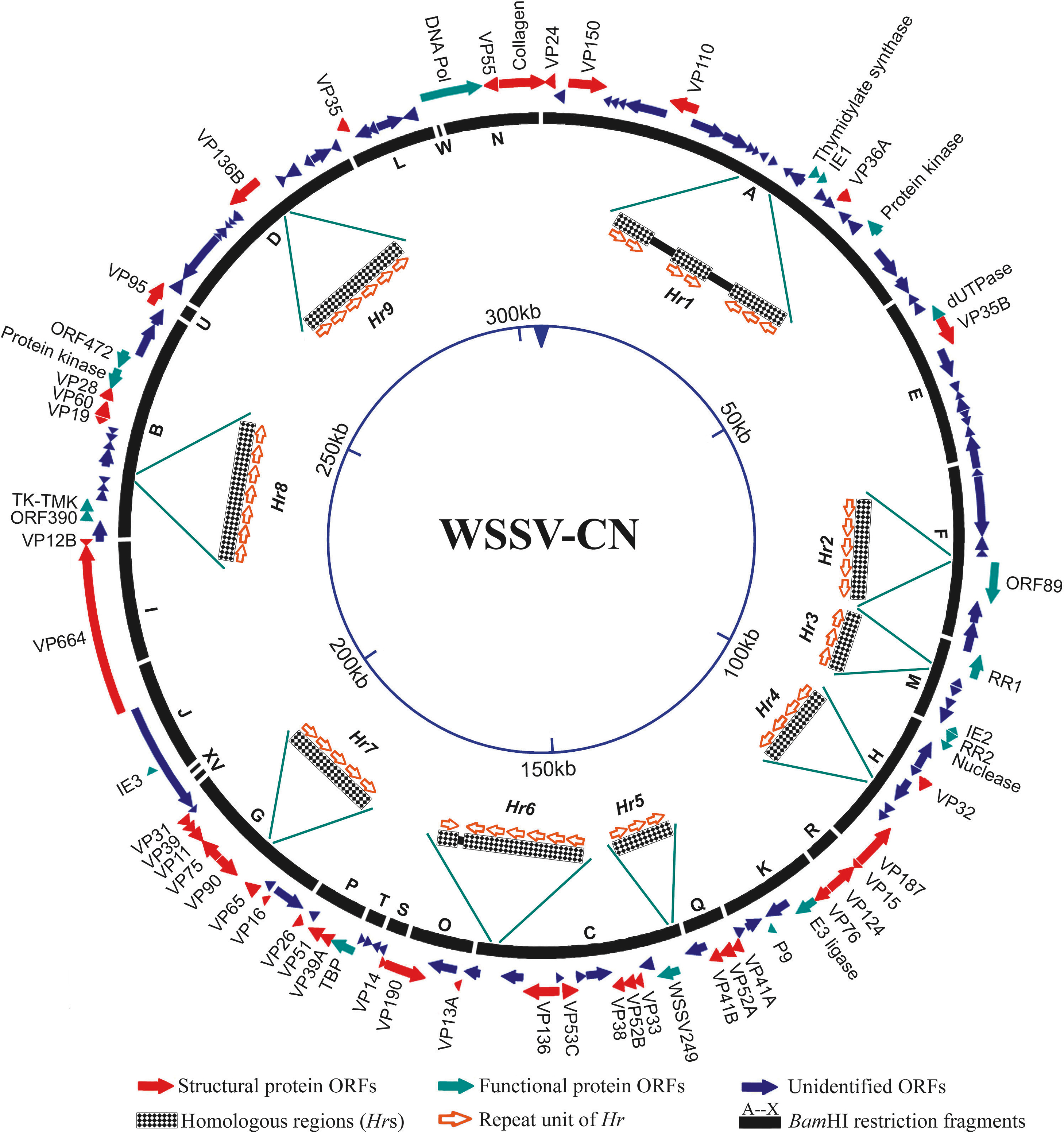 Figure 2 Schematic map of the circular dsDNA white spot syndrome virus type strain CN (WSSV-CN) genome showing the genomic organization. The solid arrows indicate the positions and direction of transcription of corresponding genes. The G at the start (GGATCC) of the largest BamHI fragment is designated position 1.