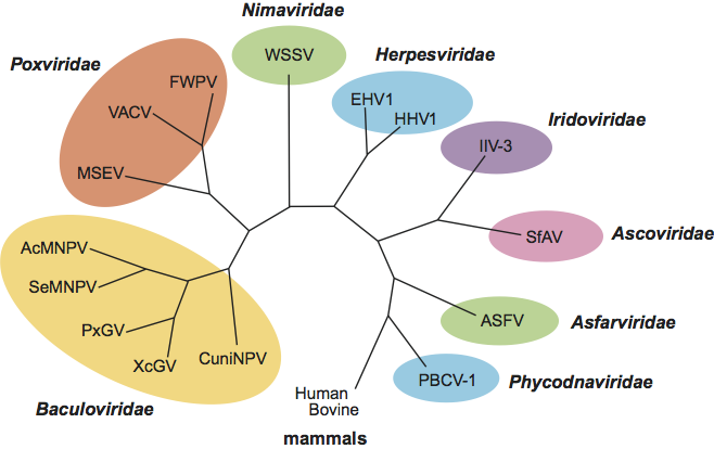 Morphologically, the WSSV virions and rod-shaped nucleocapsids resemble the budded virus particles of the baculoviruses, polydnaviruses and the unassigned Oryctes rhinoceros virus. The presence of repeat regions dispersed over the DNA genome is a property shared with members of the families Baculoviridae and Ascoviridae, the proposed Hytrosaviridae family and the unassigned nudiviruses. WSSV is phylogenetically distinct from other large DNA viruses (Figure 3).