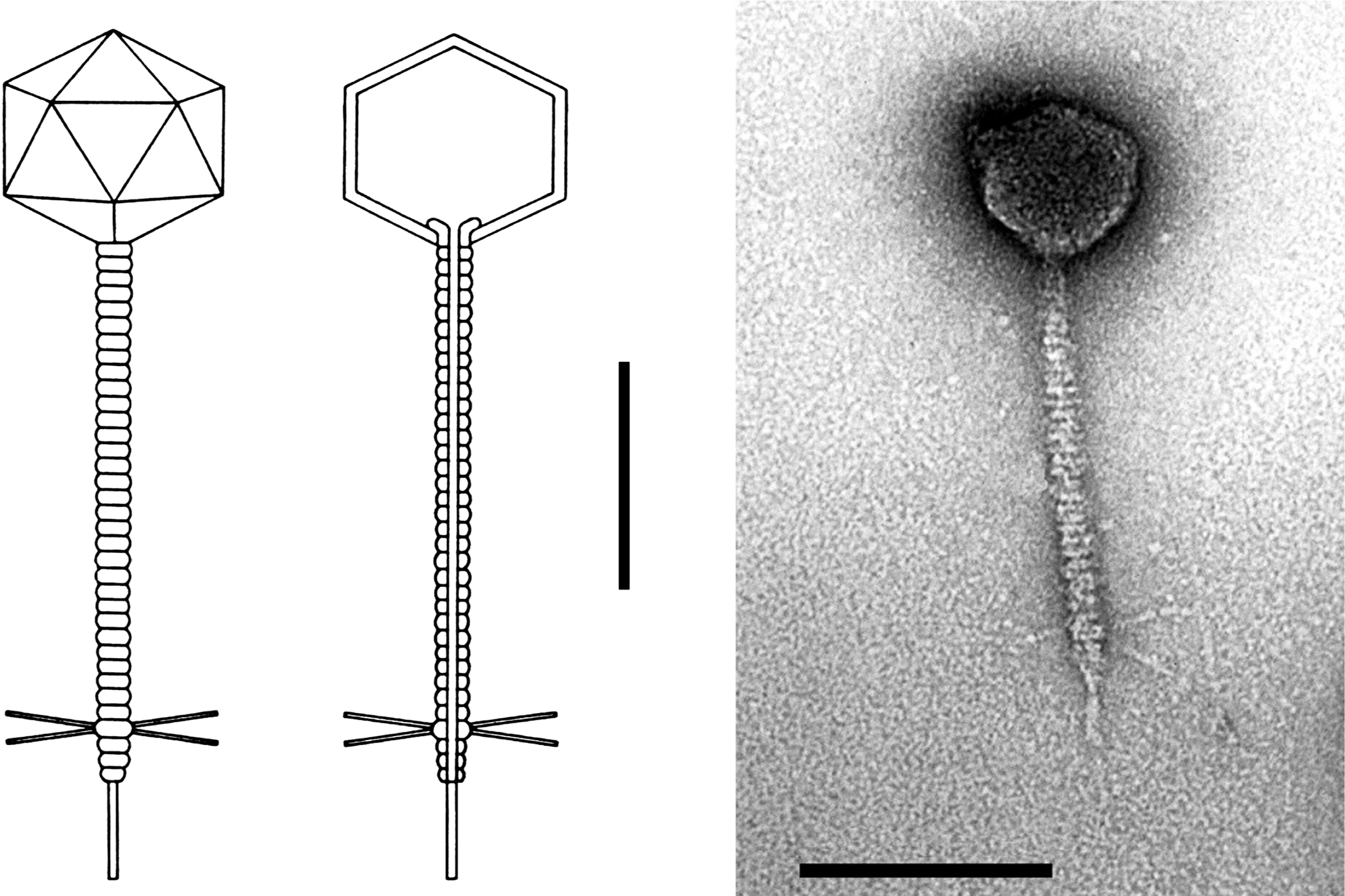 Virions have isometric heads about 53 nm in diameter and flexible tails 100 nm long and 5 nm wide, a base plate of 15 nm and four tail fibers with terminal knobs (“toes”).