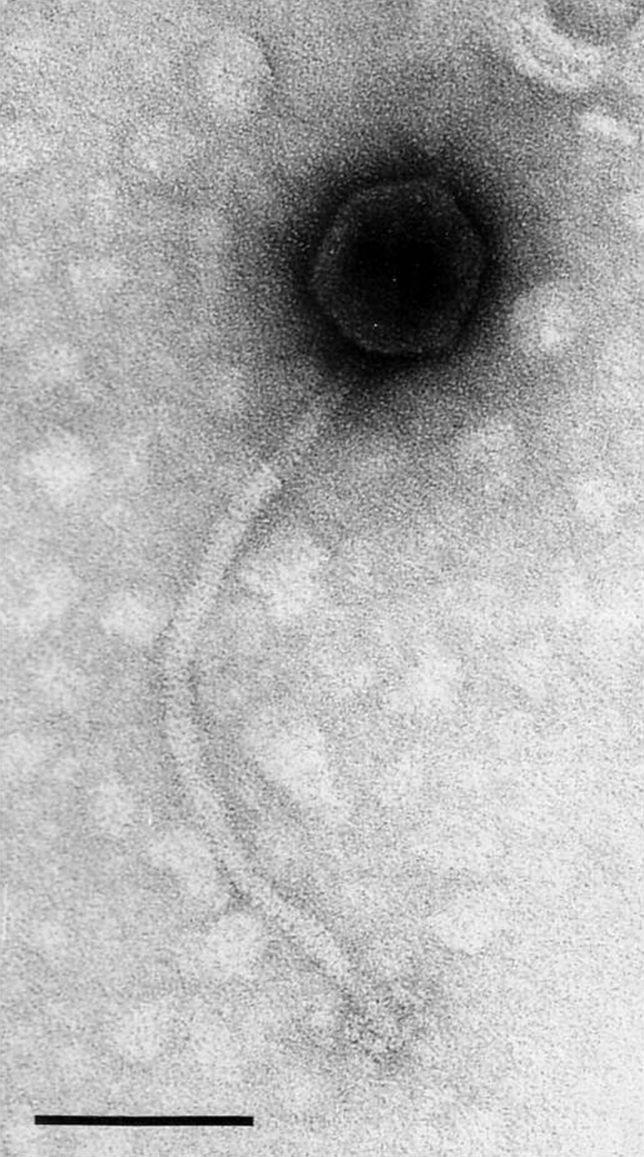 Figure 1 Enterobacteria phage  (): (left) representative diagram of a phage  particle; (right) electron micrograph of phage  particles with negative staining. The bar represents 100 nm.