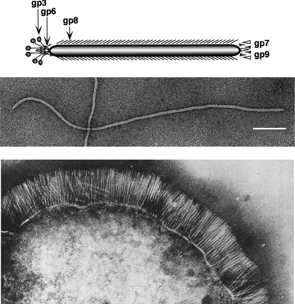 Figure 1 (Upper) A fanciful diagram to represent all members of the Inoviridae family (from A. Kornberg and T.A. Baker (1991). DNA Replication, 2nd edn. W.H. Freeman, New York; with permission); the gene numbering is for the closely related inoviruses f1, fd and M13 (often referred to, collectively or individually, as Ff phage). (Center) Negative contrast electron micrograph E. coli phage fd showing the differing end morphologies. Bar represents 100 nm; magnification about 180,000 (from C. Gray et al. (1981). J. Mol. Biol.146, 621627). (Lower) Electron micrograph of innumerable copies of the plectrovirus species Spiroplasma phage SpV1 extruding from the membrane of S. citri; magnification 60,000