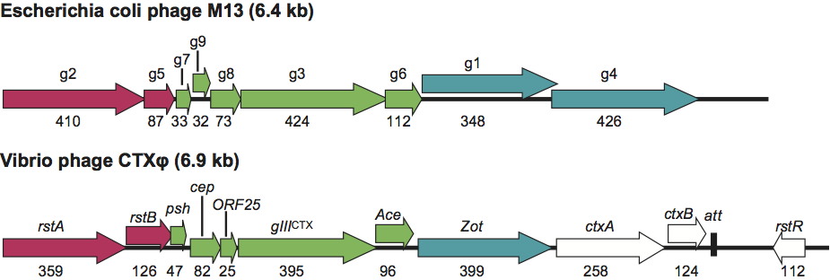 Figure 2 Linear presentations of circular genomes of non-integrative E. coli phage M13 (Upper, 6.4 kb), and integrative Vibrio phage CTX (Lower; 6.9 kb). They are organized in modules of replication genes (red), structural genes (green) and morphogenesis genes (blue). Gene numbers and names are from classical genetic mapping studies Gene 10 (DNA replication) and gene 11 (morphogenesis) are derived translationally from the C-terminal thirds of genes 2 and 1, respectively. Note the loci of the cholera toxin subunits A and B correspond to the locus of g4 in M13 and that the repressor RstR is expressed from the complementary strand.