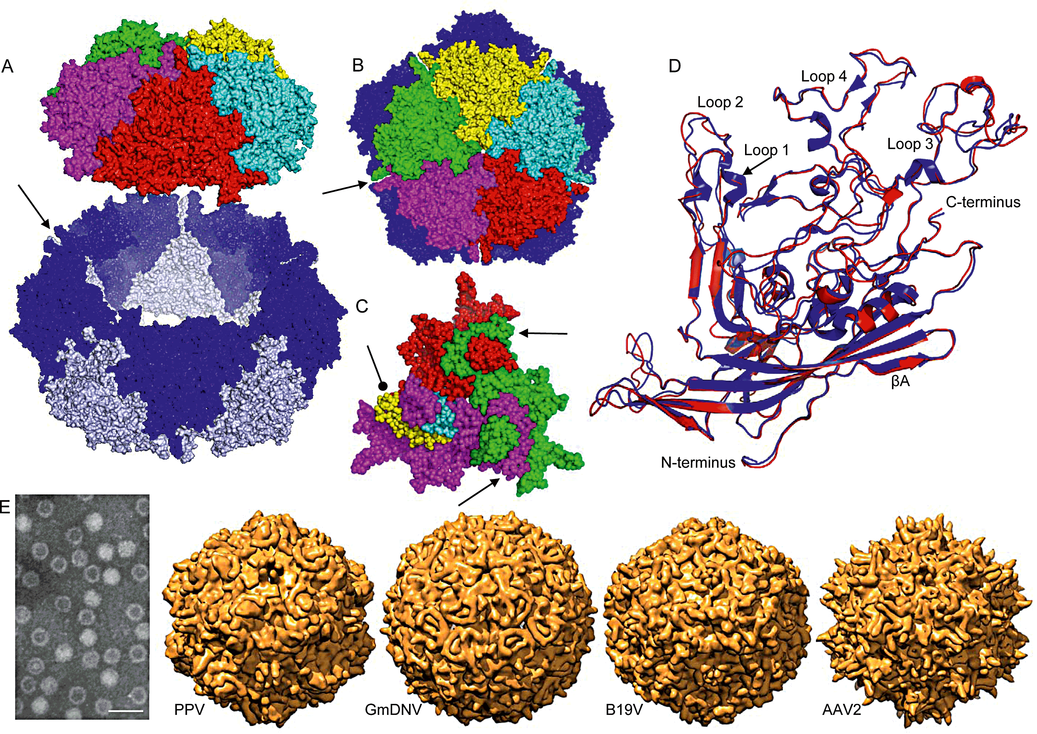 Figure 1 Morphology of parvoviruses. (A) Side-view, at a resolution of 3.5 , of a tilted model of a porcine parvovirus (PPV) capsid with the top five trimers translated 120 along its 5-fold axis from the middle body of 10 trimers (five shown in dark blue and five in light blue); the bottom five trimers are not shown. The 5-fold axes are located at the intersection of five trimers (e.g. at arrow: green, magenta, two dark blue and one light blue colored trimer). (B) Top view of model shown in (A), without light-blue trimers, along the 5-fold axis. The channels at the 5-fold axes are clearly visible (arrow indicates same 5-fold axis as shown by arrow in (A)). (C) Structure of a PPV trimer. The arrows indicate the intertwining of the GH-loop (between strands G and H) in the counter-clockwise located proteins from near the 3-fold axis towards the 2-fold axis (arrows). The GH-loop actually consists of two loops of which one (loop 3, yellow), running to the 2-fold axis, is partly covered by loop 4 (cyan) near the 3-fold axis (oval arrow). (D) Parvoviruses may have remarkably similar structures despite low sequence identities. This figure shows the alignment of minute virus of mice (MVM, in red; 549 amino acid residues, PDB 1mvm) and PPV (in blue; 542 amino acid residues, PDB 1k3v) structural proteins that have only 52% sequence identity. Nevertheless, 528 Cs (97%) of the residue pairs occupy the same position in the capsid (root-mean-square error of 1.0 ). (E) Negative contrast electron micrograph of empty and full PPV particles (bar=50 nm) and space-filling models of the capsid structures of PPV, Galleria mellonella densovirus (GmDNV; PDB: 1DNV), human B19 virus (B19V; PDB: 1s58), and adeno-associated virus - 2 (AAV-2; PDB: 1lp3) shown at a resolution of 4 . In each case, the view is down a 2-fold axis at the centre of the virus, with 3-fold axes left and right of centre, and 5-fold axes above and below. Models (A-D) have been rendered by PyMOL and the space-filling models by CHIMERA (Multiscale Models).