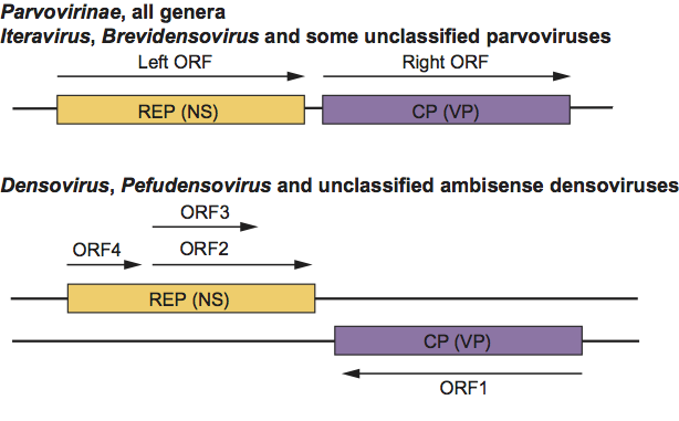 Figure 2 Gene organization for members of the monosense subfamily Parvovirinae, the genera Iteravirus and Brevidensovirus, and some unassigned parvoviruses (top). Gene organization for the ambisense densoviruses and some unassigned densoviruses (bottom).