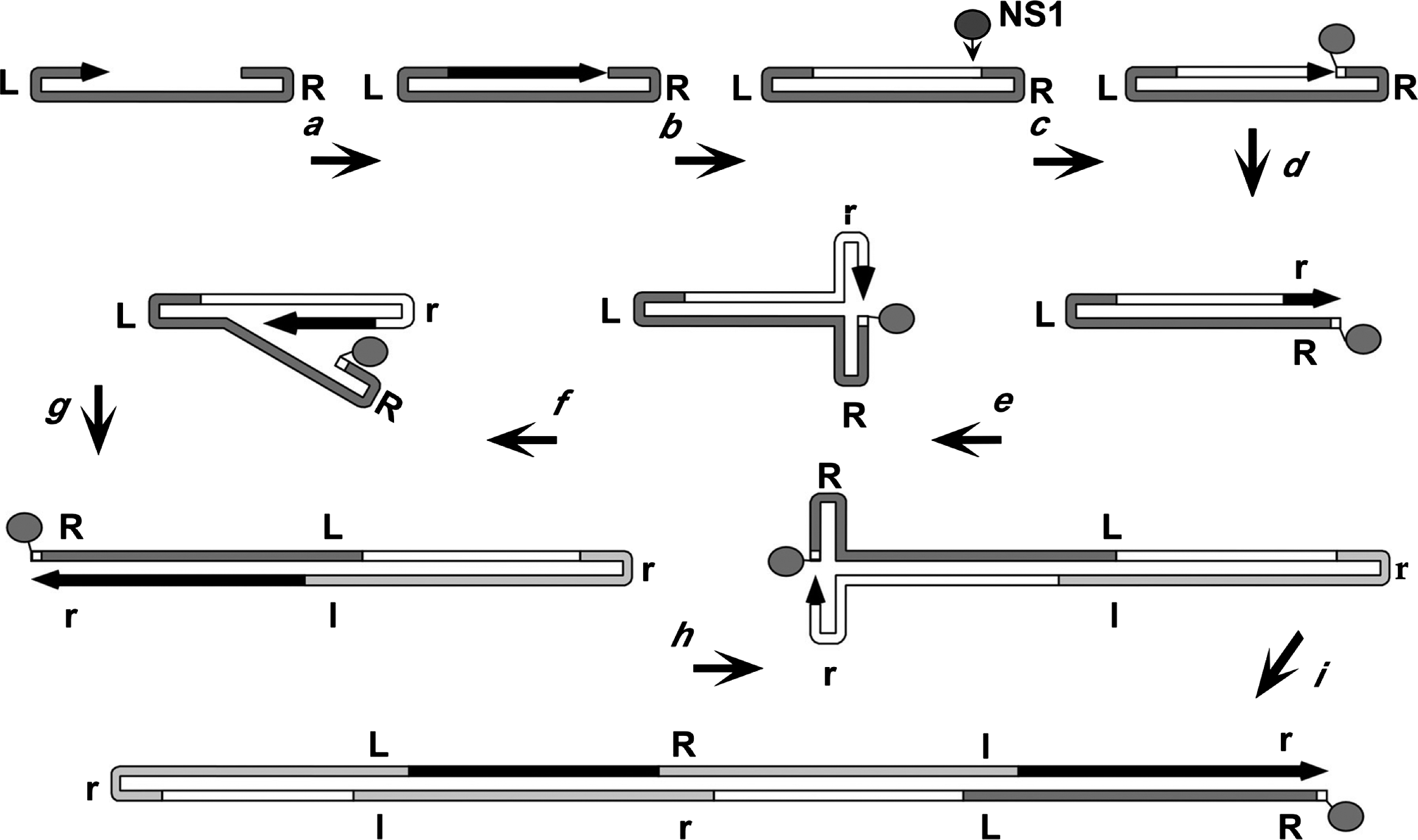 When inversion occurs on the first monomer formed after uncoating, it regenerates the “tether” sequence, lost during entry, and now attached to a newly synthesized NS1 molecule. Extended-form right-end termini are melted out and reformed into hairpin “rabbit ear” structures in a process facilitated by direct binding of NS1 to sequences in the terminus (step e). This allows the newly synthesized DNA to create the base-paired hairpin structures needed to prime synthesis of additional linear sequences (step f). This gives rise to a palindromic duplex dimeric (step g), which can undergo the same right-end rearrangement (step h), leading to the synthesis of tetrameric concatemers (step h), in which alternating unit length genomes are fused in left-end:left-end and right-end:right-end orientations. Individual genomic monomer duplexes are then excised from these concatemers by a process called junction resolution.