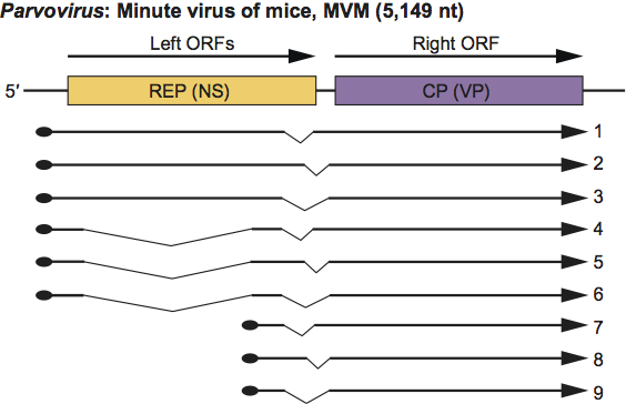 Figure 4 Gene organization and transcription scheme for members of the genus Parvovirus, as shown for minute virus of mice (MVM). Genes are shown as boxes. The left ends of the mRNAs (thick lines) are the sites of the mRNA caps (filled circles), the right ends are the polyadenylation sites (arrows); introns are indicated by thin lines.