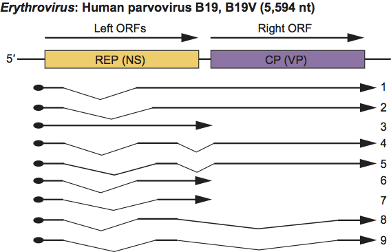 Figure 5 Gene organization and transcription scheme for members of the genus Erythrovirus, as shown for human parvovirus B19 (B19V). Genes are shown as boxes. The left ends of the mRNAs (thick lines) are the sites of the mRNA caps (filled circles), the right ends are the polyadenylation sites (arrows); introns are indicated by thin lines.