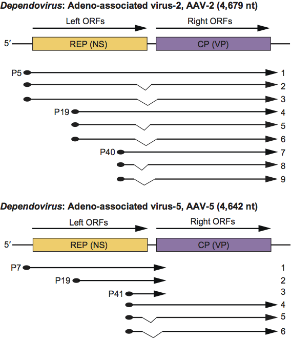 Figure 6 Gene organization and transcription scheme for members of the genus Dependovirus, as shown for adeno-associated virus 2 (AAV-2) and the nonprimate adeno-associated virus 2 (AAV-5). Genes are shown as boxes. The left ends of the mRNAs (thick lines) are the sites of the mRNA caps (filled circles), the right ends are the polyadenylation sites (arrows); introns are indicated by thin lines. In contrast to the primate AAVs, nonprimate AAVs also have a polyadenylation site in the middle of the genome. Both types of AAVs have 3 promoters.