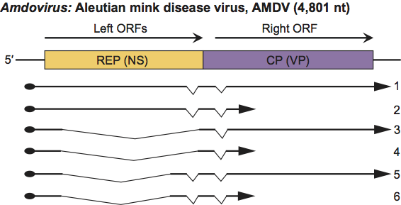 Figure 7 Gene organization and transcription scheme for the member of the genus Amdovirus, as shown for Aleutian mink disease virus (AMDV). Genes are shown as boxes. The left ends of the mRNAs (thick lines) are the sites of the mRNA caps (filled circles), the right ends are the polyadenylation sites (arrows); introns are indicated by thin lines (1=R1; 2=R1; 3=R2; 4=R2; 5=Rx; 6=Rx).
