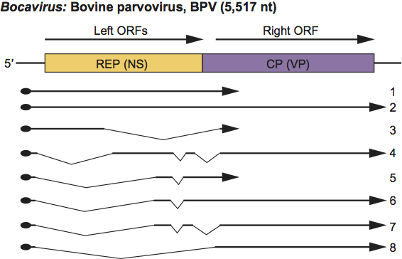 Figure 8 Gene organization and transcription scheme for members of the genus Bocavirus, as shown for bovine parvovirus (BPV). Genes are shown as boxes. The left ends of the mRNAs (thick lines) are the sites of the mRNA caps (filled circles), the right ends are the polyadenylation sites (arrows); introns are indicated by thin lines