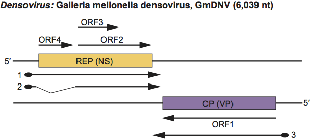 Figure 9 Gene organization and transcription scheme for members of the ambisense genus Densovirus, as shown for Galleria mellonella densovirus (GmDNV). Genes are shown as boxes as well as the ORFs that they contain. The starts of the mRNAs (thick lines) are the sites of the mRNA caps (filled circles), the ends are the polyadenylation sites (arrows); the intron is indicated by thin lines. ORF1 and ORF2/3 are translated by a leaky scanning mechanism from transcript 3 and 2, respectively.