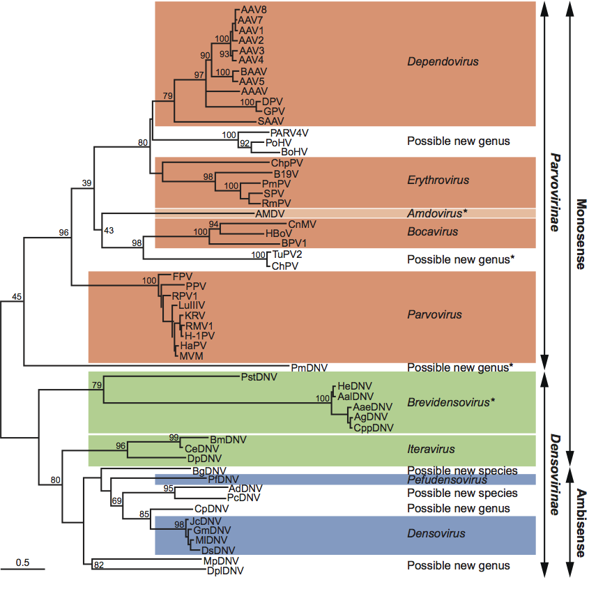 Figure 11 Phylogenetic relationship among the pleiotropic NS1 proteins of members of the family Parvoviridae. The tree was constructed with the programs included in the Phylip package at the http://mobyle.pasteur.fr/cgi-bin/portal.py website (ClustalW-multialign, Phylip distance matrix, PROTDIST, Neighbor-Joining method, and phylogenetic tree drawing). The percentage of replicate trees in which the associated taxa clustered together in the bootstrap test (1000 replicates) are shown next to the branches. The scale bar represents the rate of amino acid substitutions. This phylogenetic analysis distinguishes the two subfamilies, as well as the monosense and ambisense densoviruses, and recognizes the different genera as separate clades. Several other clades that are possible new genera, as described in the text, are also recognized. The asterisk indicates clades of viruses that do not contain the phospholipase A2 motif in their capsid proteins.